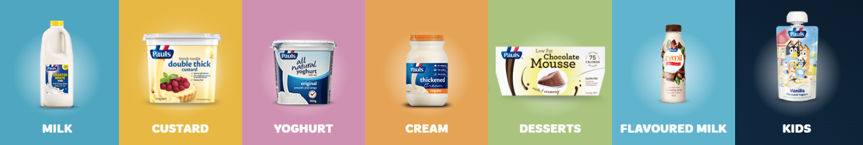 Pauls has a range of milks for the whole family, from Full Cream and Smarter White Milk, to PhysiCAL, Zymil, Skinny Milk and more. We also have plenty of other dairy products packed with goodness, including a deliciously good range of custards, yoghurts, creams, desserts, sour creams and flavoured milks.